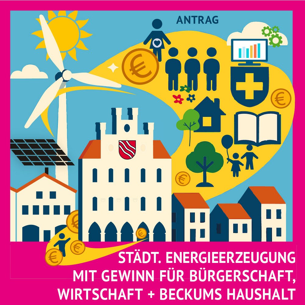 Die Fraktion Bündnis 90/Die Grünen beantragt, dass die Stadt Beckum die Möglichkeiten Stadteigener nachhaltiger Energieerzeugung unter Berücksichgung der nachfolgenden Aspekte prüft und die Ergebnisse bis zum Ende des zweiten Quartals 2026 im zuständigen Aussschuss darstellt: